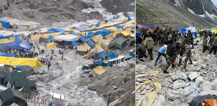 حکام نے بتایا کہ بادل پھٹنے سے شدید بارشیں ہوئیں اور دیکھتے ہی دیکھتے سیلابی صورت حال پیدا ہوئی اور سیلابی پانی غار کے باہر بیس کیمپ سے ٹکرا گیا، جس کے نتیجے میں کئی یاتری اپنے خیموں سمیت سیلابی ریلے میں بہہ گئے۔امدادی کاموں کے دوران دل خراش مناظر دیکھنے کو ملے، کئی یاتری اپنے پیاروں کو زندہ درگور دیکھ کر ہوش وحواس کھو بیٹھے، تنگ راستوں کے باعث امدادی ٹیمیں تاخیر سے جائے حادثے پر پہنچی اور انہوں نے کئی افراد کو کیچڑ اور مٹی سے نکالا ، زخمی یاتریوں کو سانس لینے میں شدید دقت کا سامنا تھا، موقع پر موجود ٹیموں نے انہیں آکسیجن فراہم کی۔