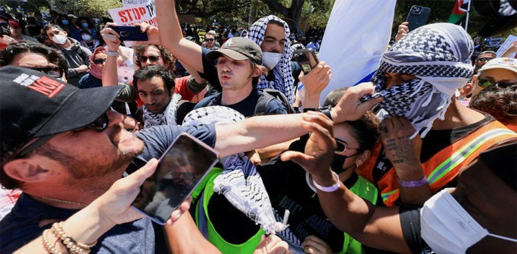 امریکی میڈیا نے بتایا کہ اسرائیل نواز طلبہ نے غزہ جنگ بندی کیلئے جاری مظاہرہ ختم کرانے کی کوشش کی۔ تصادم کے بعد یونیورسٹی آف کیلی فورنیا میں پولیس تعینات کردی گئی ہے۔