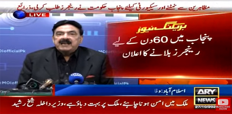 وفاقی وزیرداخلہ شیخ رشید نے اسلام آباد میں ہنگامی پریس کانفرنس کرتے ہوئےاعلان کیا کہ صوبائی حکومت کی درخواست پر 2 ماہ کے لیے پنجاب میں رینجرز تعیناتی کے احکامات جاری کر رہے ہیں اور اس حوالے سے باقاعدہ نوٹیفکیشن جاری کیا جائے گا۔