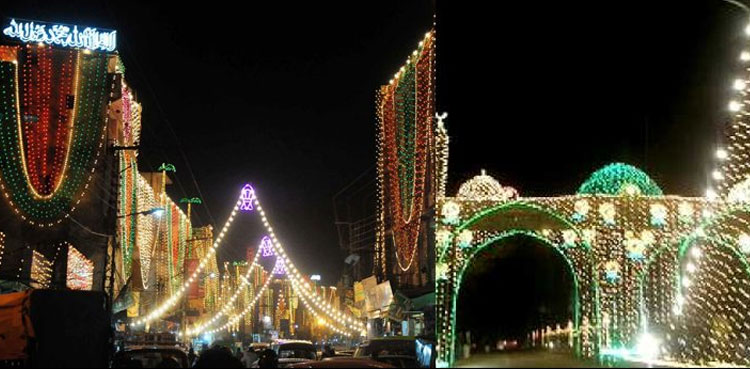 جشن عید میلادالنبی کے سلسے میں شہر بھر کی مساجد، عمارتوں اور شاہرائوں کو سبز پر چموں اور برقی قمقموں سے سجایا گیا ہے، ہر طرف خوشیوں کا سما ہے۔