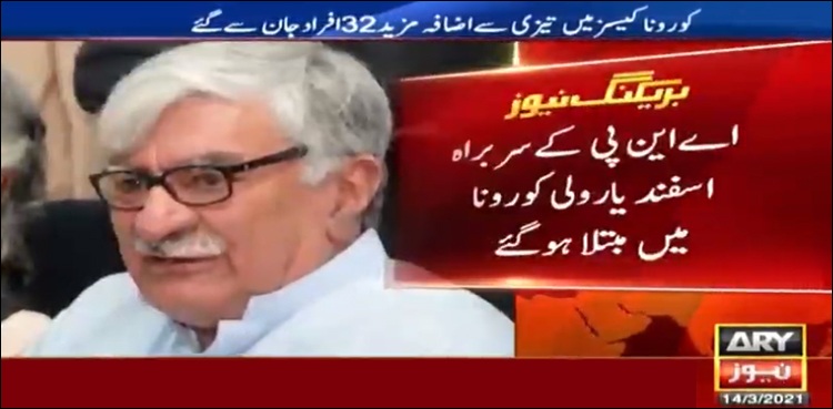اے آر وائی نیوز کی رپورٹ کے مطابق ترجمان اے این پی ثمر بلور کا کہنا ہے کہ اسفند یار ولی میں کورونا وائرس کی تشخیص ہوئی ہے جس کے بعد انہوں نے خود کو گھر میں قرنطینہ کرلیا ہے۔