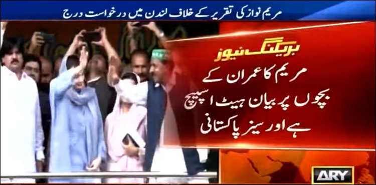 اے آر وائی نیوز کے مطابق برطانیہ میں مقیم طارق محمود نامی پاکستانی شہری نے لندن کے نواحی علاقے کینٹ کے پولیس اسٹیشن میں مریم نواز کی نفرت انگیز تقریر کے خلاف درخواست جمع کرائی۔