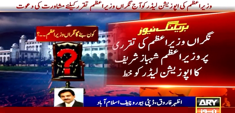 شہباز شریف نے نگراں وزیراعظم کے تقرر کے لیے اپوزیشن لیڈر سے رابطہ کیا ہے اور راجا ریاض کو خط لکھ کر انہیں آج اس اہم عہدے پر تقرری کے لیے مشاورت کی دعوت دی ہے۔ خط میں کہا گیا ہے کہ صدر مملکت کی منظوری سے قومی اسمبلی تحلیل ہو چکی جس کے بعد نگراں وزیراعظم کا تقرر کا عمل شروع ہوچکا ہے۔