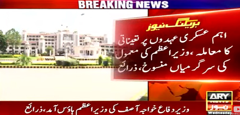 اے آر وائی نیوز کے مطابق اہم عسکری عہدوں پر تعیناتی کے لیے جی ایچ کیو سے سمری موصول ہونے کے بعد وزیراعظم شہباز شریف نے اپنی معمول کی تمام سرگرمیاں منسوخ کردی ہیں۔ اس حوالے سے ذرائع نے بتایا ہے کہ وزیر دفاع خواجہ آصف وزیر اعظم ہاؤس پہنچے ہیں اور دونوں میں اہم ملاقات جاری ہے۔