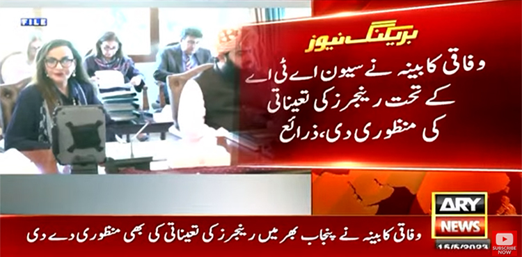 نمائندہ اے آر وائی نیوز کے مطابق وفاقی کابینہ کی جانب سےسرکولیشن سمری کے ذریعے منظوری دی گئی۔ پنجاب حکومت نے امن وامان کے قیام کےلیے رینجرز کی مدد مانگی تھی۔