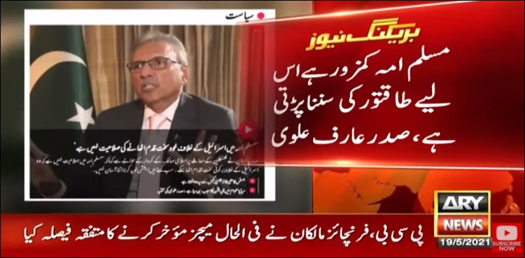 برطانوی خبررساں ادارے کو خصوصی انٹرویو دیتے ہوئے صدرِ مملکت نے اعتراف کیا کہ ’مسلم امّہ میں اسرائیل کے خلاف خود قدم اٹھانےکی صلاحیت نہیں کیونکہ ہم کمزور ہیں‘۔