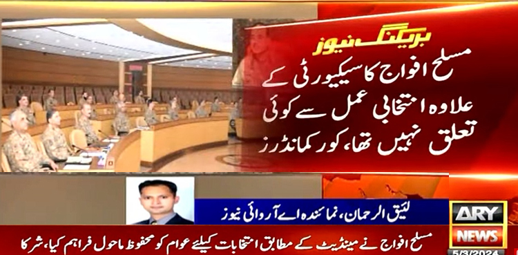 کورکمانڈرز کانفرس کے شرکأ نے عام انتخابات میں الیکشن کمیشن آف پاکستان کے منڈیٹ کے مطابق، تمام تر مشکلات کے باوجود محفوظ ماحول مُہیا کرنے پر سول انتظامیہ، قانون نافذ کرنے والے اداروں اور سیکیورٹی فورسز کی کوششوں کو سراہا ہے۔