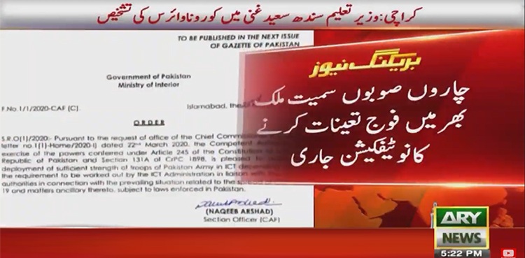 کورونا وائرس کے خطرات کے باعث وفاقی دارالحکومت اسلام آباد، چاروں صوبوں اور آزاد کشمیر سمیت ملک بھر میں فوج کو طلب کر لیا گیا۔