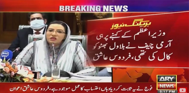 معاون خصوصی برائےاطلاعات پنجاب فردوس عاشق اعوان نے کہا ہے کہ وزیراعظم کے کہنے پر ہی آرمی چیف نے بلاول بھٹو کو کال کی تھی اب فوج نے یہ ثابت کردیا کہ وہاں احتساب کاعمل موجود ہے۔