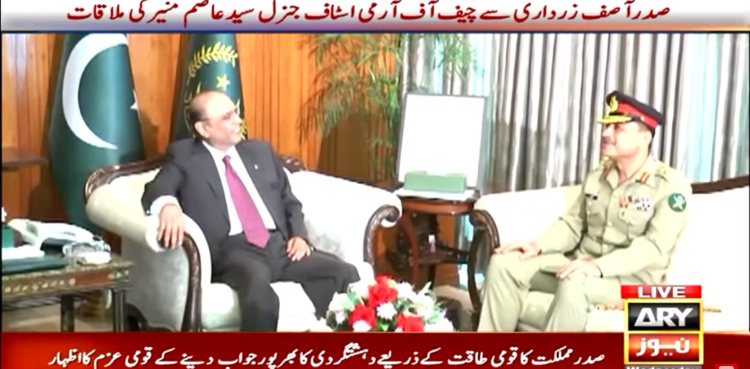 ملاقات میں آرمی چیف نے آصف زرداری کو صدر اور مسلح افواج کے کمانڈر کا عہدہ سنبھالنے پر مبارکباد دی، چیف آف آرمی اسٹاف جنرل عاصم منیر نے صدرمملکت کی کامیاب مدت کیلئے نیک خواہشات کا اظہار کیا جبکہ دوسری جانب آرمی چیف نے صدر مملکت کو دہشت گردی کے خلاف جاری فوجی آپریشنز سے آگاہ کیا۔