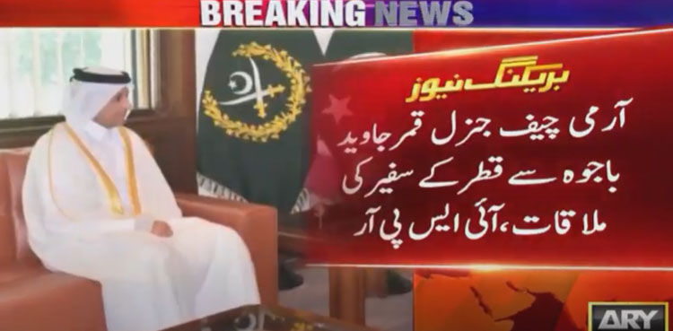 پاک فوج کے شعبہ تعلقات عامہ کے مطابق قطری سفیر نے خطے میں امن و استحکام کیلئے پاکستان کی کوششوں کی تعریف کی۔