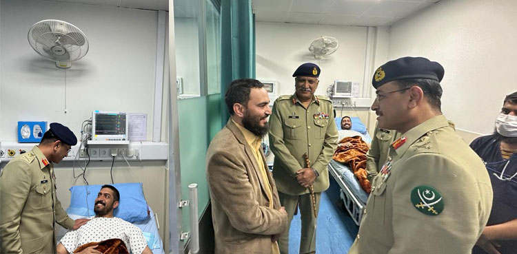 آئی ایس پی آر کے مطابق آرمی چیف نے زخمی افسران و جوانوں کی عیادت کی اور ان کے ساتھ وقت گزارا،انہوں نے افسران و جوانوں کی پیشہ وارانہ کارکردگی کو سراہا۔