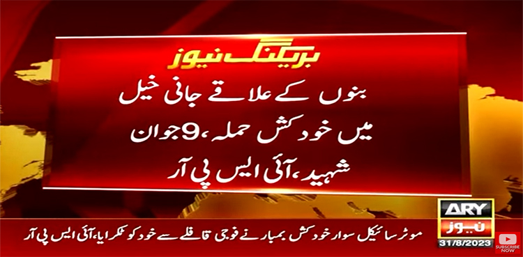 بنوں کےعلاقے جانی خیل میں پاک فوج کے قافلے پر خودکش حملے میں 9 جوان شہید ہو گئے۔