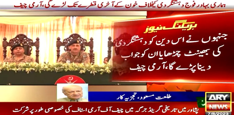 اے آر وائی نیوز کے مطابق پشاور میں تاریخی گرینڈ جرگے میں چیف آف آرمی اسٹاف سید عاصم منیر نے خصوصی طور پر شرکت کی، اس موقع پر ان کا کہنا تھا کہ فوج اور سیکیورٹی کے تمام ادارے اور پاکستان کےعوام ایک ہیں، جو لوگ امن کو برباد کرنا چاہتے ہیں وہ ہم میں سے نہیں ہیں۔