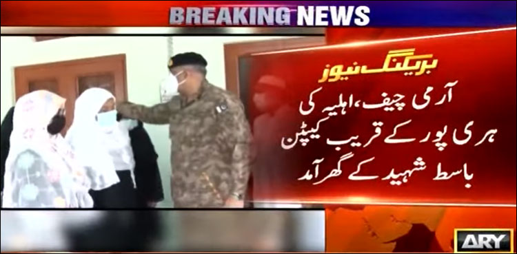 پاک فوج کے شعبہ تعلقات عامہ (آئی ایس پی آر) کے مطابق پاکستان بّری افواج کے سربراہ آرمی چیف جنرل قمر جاوید باجوہ کی اہلیہ کے ہمراہ عید کے دوسرے روز وطن عزیز پر جان قربان کرنے والے کیپٹن باسط علی کے گھر آمد ہوئی، آرمی چیف نے شہید کیپٹن کے بلندی درجات کےلیے فاتحہ خوانی۔
