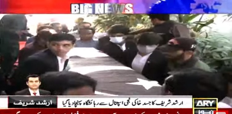 تفصیلات کے مطابق سینئر صحافی ارشد شریف کا جسد خاکی نجی اسپتال سے ان کی رہائش گاہ منتقل کردیا گیا۔
