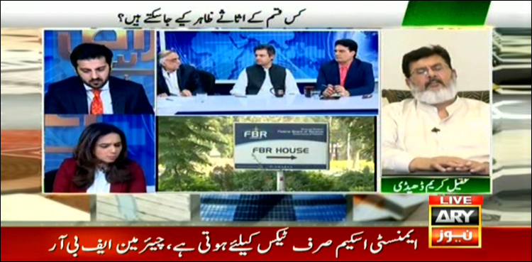 اُن کا کہنا تھا کہ نادرا،کسٹم،ایف بی آرکےتعاون سےڈیٹاجمع کیاگیا، نادراسےگزارش کی ہے کہ پیسوں میں کمی کی جائے، پوری دنیا میں ایمنسٹی اسکیم لائی جاتی ہے، گزشتہ ایمنسٹی میں اثاثےظاہر کرنے والوں کے خلاف کچھ نہیں کیا گیا، ہم بھی ڈیٹا دیکھ رہےہوتےہیں توہمارےسامنےاس کانام نہیں ہوتا۔