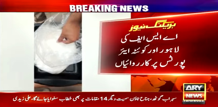 ائیرپورٹس سکیورٹی فورس (اے ایس ایف) نے لاہور اور کوئٹہ کے ایئر پورٹ پر دو مختلف کارروائیوں میں مسافروں سے منشیات برآمد کرلی۔