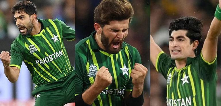 پاکستانی فاسٹ بولرز کی دہشت اتنی کہ تین میچوں کی 30 وکٹوں میں سے 23 وکٹیں شاہین شاہ، نسیم شاہ اور حارث رؤف پر مشتمل ٹرائیکا نے حاصل کیں۔