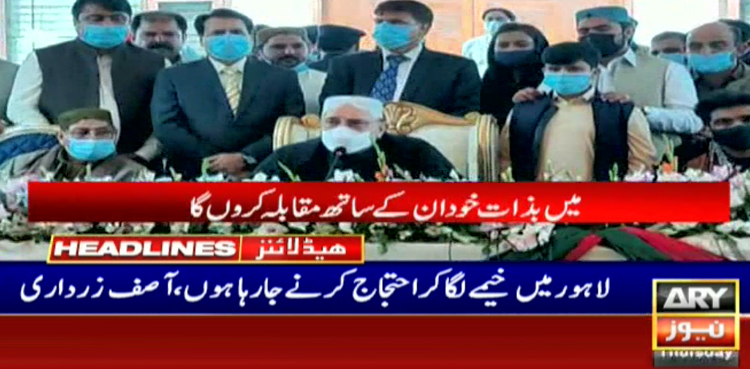 اے آر وائی نیوز کے مطابق پارٹی کارکنان سے خطاب میں آصف علی زرداری نے لاہورمیں خیمہ لگا کربیٹھنےکا اعلان کیا۔
