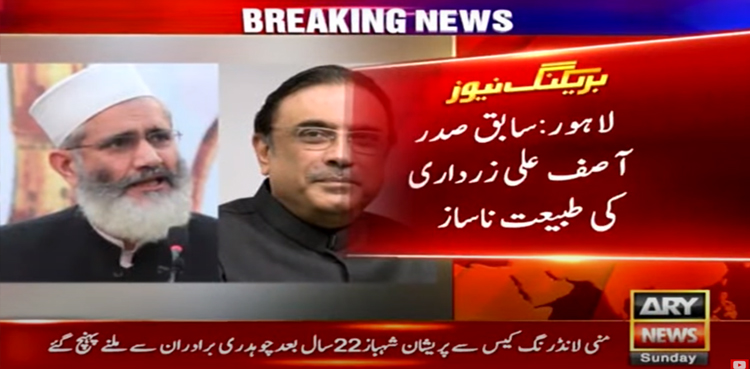 اے آر وائی نیوز کے مطابق سابق صدر آصف علی زرداری اور امیر جماعت اسلامی پاکستان سراج الحق میں آج شام 7 بجے جماعت اسلامی کے مرکز منصورہ میں ملاقات تھی تاہم آصف علی زرداری کی طبیعت ناساز ہونے پر ملاقات کو ملتوی کر دیا گیا ہے۔
