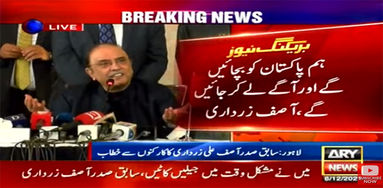 لاہور میں پارٹی کارکنوں سے خطاب کرتے ہوئے سابق صدر نے کہا کہ میں نےمشکل وقت میں جیلیں کاٹیں ہم پاکستان کو بچائیں گے اور آگے لےکر جائیں گے ہم نے پاکستان کو بچانےکا عہد کیا ہوا ہے۔