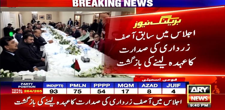 تفصیلات کے مطابق اجلاس میں سابق صدر آصف زرداری کی صدارت کا عہدہ لینے کی بازگشت بھی سنائی دی۔ ذرائع نے بتایا کہ پی پی ارکان کا کہنا تھا کہ ہر جگہ بات ہو رہی ہے پی پی کو صدارت کی آفر ہوئی ہے۔