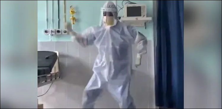 انہوں نے لکھا کہ ’میرے دوست سے ملیں جو کوویڈ 19 کی ڈیوٹی پر مامور ہے، وہ کورونا وائرس سے خوفزدہ مریضوں کو خوش کرنے کے لیے ان کے سامنے رقص کررہا ہے۔