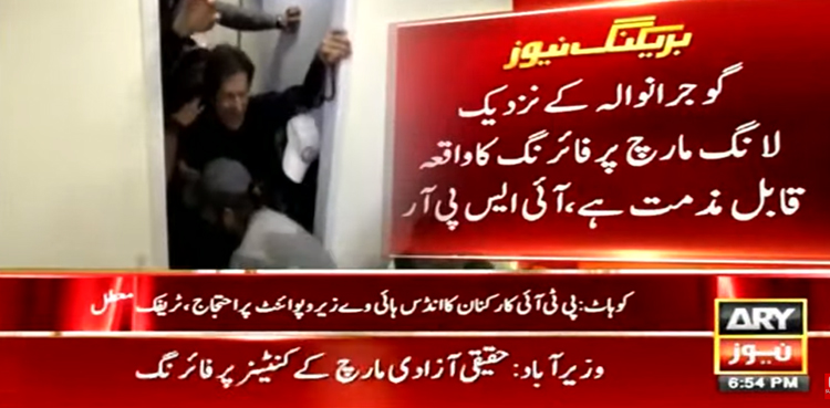 فائرنگ کے بعد بھگدڑ مچ گئی اور کینٹینر پر موجود رہنما بھی گھبرا گئے۔ فائرنگ کے وقت قافلہ ظفر علی خان چوک کے قریب پہنچا تھا۔ کارکنان عمران خان کو ہاتھوں میں اٹھا کر کنٹینر سے گاڑی میں لے کر روانہ ہوئے۔
