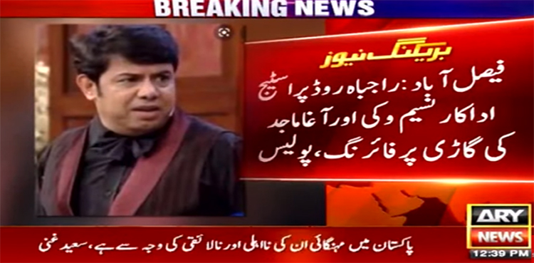 پولیس ذرائع کے مطابق فیصل آباد کے راجباہ روڈ پر نامعلوم حملہ آور نے اسٹیج اداکار نسیم وکی اور آغاماجد کی گاڑی پر فائرنگ کی ، حملہ آور موٹرسائیکل پر سوار پر سوار تھے۔