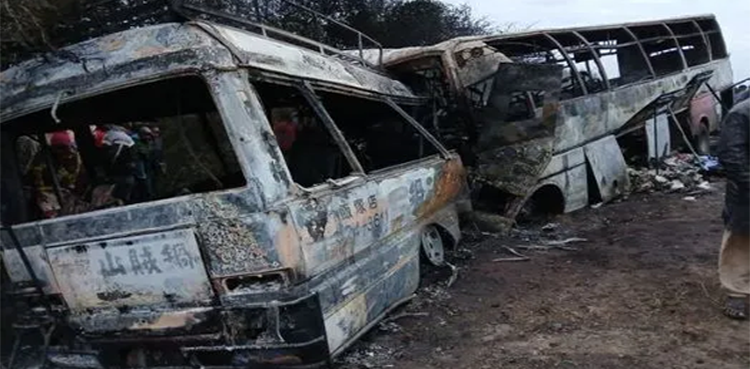 بین الاقوامی میڈیا رپورٹس کے مطابق تنزانیہ میں بس اور منی بس کے درمیان خوفناک تصادم کے بعد دونوں گاڑیوں آگ لگنے سے مکمل جل گئیں۔