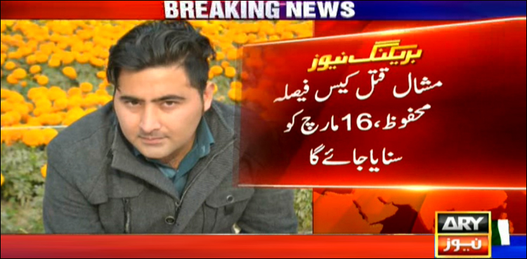 پشاور: انسداددہشت گردی عدالت، پشاور نے مشال قتل کیس کا فیصلہ محفوظ کرلیا، فیصلہ 16 مارچ کو سنایا جائے گا.
