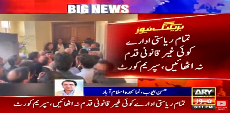 سپریم کورٹ نے واضح ہدایات دیں کہ اسمبلی میں جو ہوا اس پر ججز نےنوٹس لینےکافیصلہ لیا تمام ریاستی ادارے کوئی غیرقانونی قدم نہ اٹھائیں امن وامان کی صورتحال خراب نہیں ہونی چاہیے تمام سیاسی جماعتیں امن وامان یقینی بنائیں۔