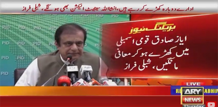 اسلام آباد میں پریس کانفرنس کرتے ہوئے شبلی فراز نے کہا کہ اصل مسئلہ ایازصادق کا کل کا بیان ہے ،ایازصادق سے ابھی نندن سے متعلق بیان پر قوم حساب لےگی ایازصادق قومی اسمبلی میں کھڑے ہوکر معافی مانگیں۔