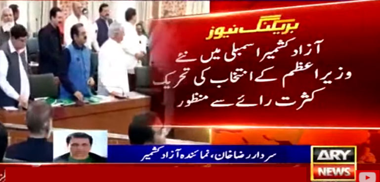 اے آر وائی نیوز کے مطابق آزاد کشمیر کے نئے وزیراعظم کے انتخاب کیلیے اسمبلی میں تحریک کثرت رائے سے منظور کرلی گئی، اس موقع پر اپوزیشن نے شدید احتجاج کیا۔