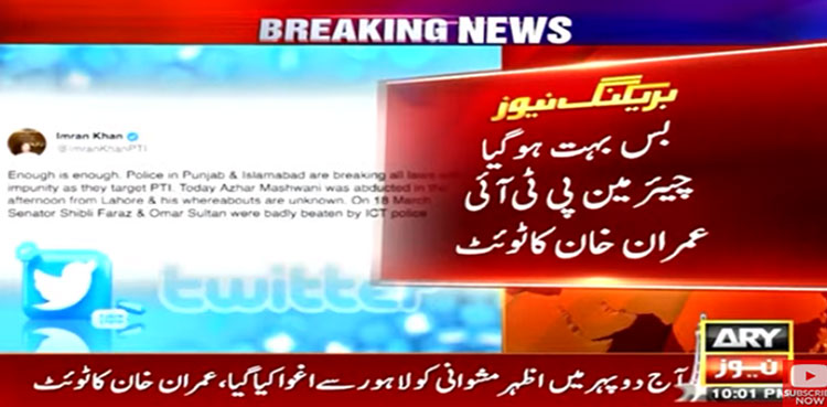 عمران خان نے لکھا کہ آج دوپہر میں اظہر مشوانی کو لاہور سے اغوا کیا گیا،اظہر مشوانی کو کہاں رکھا گیا پتہ نہیں چل رہا ہے۔