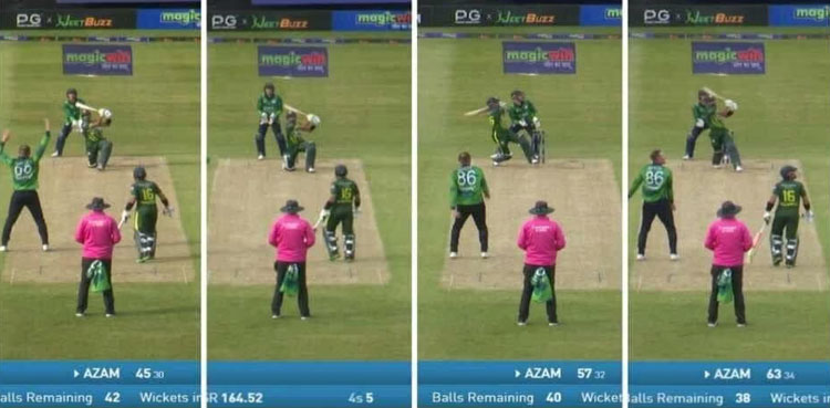 بابر اعظم نے آئرش لیگ اسپنر کو ایک اوور میں چار بلند و بالا چھکے جڑے، بینجمن وائٹ کو انھوں نے اننگز کے 14ویں اوورمیں پہلا چھکا نہایت دلکش انداز میں اسٹریٹ پر مارا جبکہ دوسرا چھکا بھی سیدھ میں ہی گراؤنڈ سے باہر گیا۔ تیسرے چھکے کے لیے بیٹر نے لیگ سائیڈ کا انتخاب کیا۔