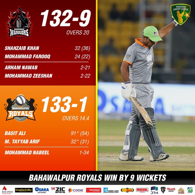 بلے باز باسط علی کو شاندار کھیل کا مظاہرہ کرنے پر میچ کا بہترین کھلاڑی قرار دیاگیا۔۔۔ شاویز عرفان 4 سکور بنا کر آوٹ ہوئے جبکہ محمد طیب 32 رنز کے ساتھ ناٹ آوٹ رہے،،بہاولپور رائلز کی ٹیم نے مطلوبہ ہدف14.5 اوورز میں ایک وکٹ کے نقصان پر پورا کر کے فائنل میں پہنچ گئی ہے۔ مردان واریئیرز کے باؤلر محمد نبیل واحد وکٹ حاصل کرنے میں کامیاب ہوئے۔۔