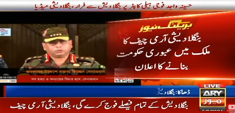 بنگلہ دیش کے آرمی چیف جنرل وقار الزماں نے شیخ حسینہ واجد کے مستعفی ہونے اور ملک چھوڑنے کے بعد عوام سے اپنے پہلے خطاب میں انہیں صبر کی تلقین کی ہے اور ملک کا نظام چلانے کے لیے مخلوط حکومت بنانے کا اعلان کرتے ہوئے کہا ہے کہ اب تمام فیصلے فوج کرے گی۔