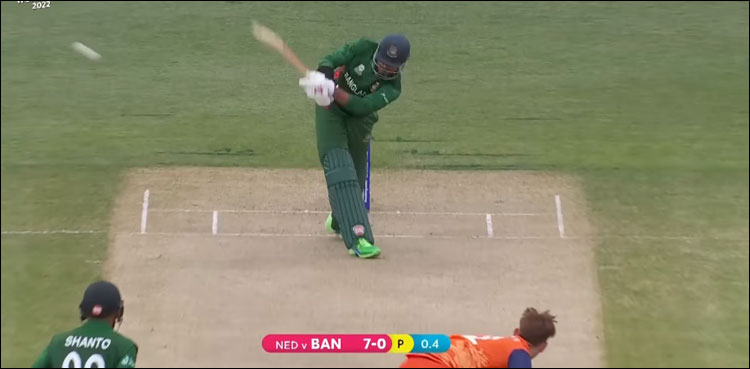 ہوبارٹ: بنگلادیش کے اوپنر بیٹسمین سومیا سرکار نے نیدرلینڈز کے خلاف پہلے اوور میں دل کش اسٹروکس کھیلے۔
