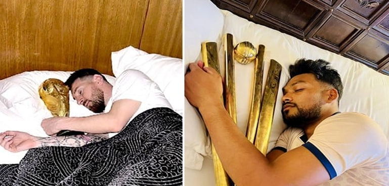 یہ تصویر دیکھ کر شائقین کھیل کو 2022 کا وہ وقت یاد آ گیا جب لیونل میسی نے 36 سال بعد اپنی ٹیم ارجنٹینا کو قطر میں کھیلے گئے فیفا ورلڈ کپ میں عالمی چیمپئن بنوایا تھا اور ان کا بھی ٹرافی کو گلے سے لگا کر بستر پر سونے کا پوز سوشل میڈیا پر تیزی سے وائرل ہوا تھا۔