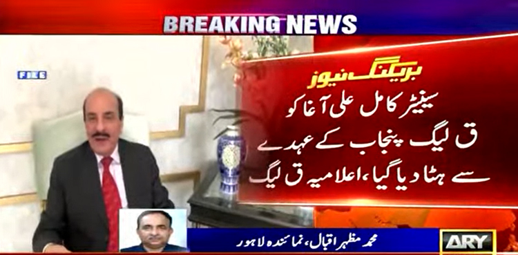 ق لیگ کی جانب سے جاری اعلامیے کے مطابق کامل علی آغا کو ق لیگ پنجاب کے عہدے سے ہٹادیا گیا ہے۔
