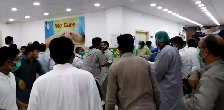 اسپتال میں لڑائی کے باعث مریضوں میں شدید خوف و ہراس پھیل گیا، واضح رہے کہ کرونا وائرس مریضوں کے سبب ملک بھر کے اسپتالوں کو آکسیجن اور وینٹی لیٹرز کی شدید کمی کا سامنا ہے۔