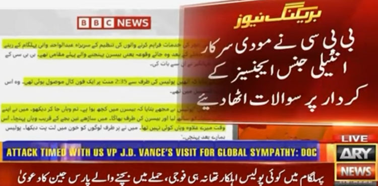 اے آر وائی نیوز کے مطابق پہلگام میں فالس فلیگ آپریشن کے بعد بی بی سی کی رپورٹ میں سوال اٹھایا گیا ہے کہ پہلگام جیسے سیاحتی مقام پر سیکیورٹی موجود کیوں نہیں تھی، پہلگام حملے کے بعد پولیس کم ازکم ایک گھنٹے بعد جائے وقوع پر پہنچی۔
