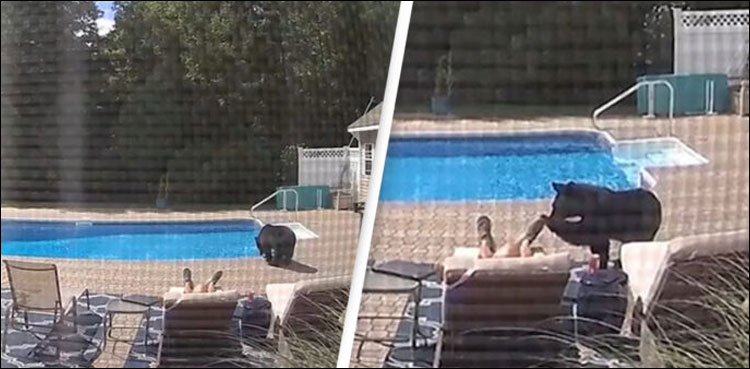 ایسا ہی ایک واقعہ امریکا میں پیش آیا جہاں ایک شخص اپنے گھر کے پیچھے بنے سوئمنگ پول قریب لیٹا ہوا دھوپ سیکھ رہا تھا کہ اچانک ایک ریچھ اس کے قریب آگیا، واقعے کی ویڈیو سوشل میڈیا پر خوب وائرل ہورہی ہے۔