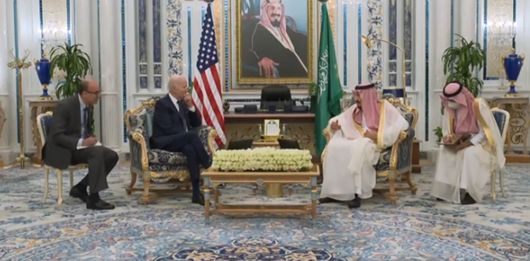 خبر ایجنسی کے مطابق ملاقات میں امریکی صدر نے سعودی تیل کی پیداوار بڑھانے، انسانی حقوق اور سیکیورٹی تعاون بڑھانے پر بات چیت کی۔
