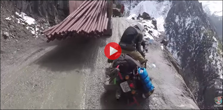 ویڈیو میں دیکھا جاسکتا ہے کہ زوجیلا پاس پر ایک طرف کھائی ہے اور دشوار گزار سڑک پر برف بھی پڑی ہوئی ہے، سڑک پر ایک ٹرک جارہا ہے اور اس کے پیچھے موٹر سائیکل سوار بھی موٹر سائیکل چلا رہا ہے۔