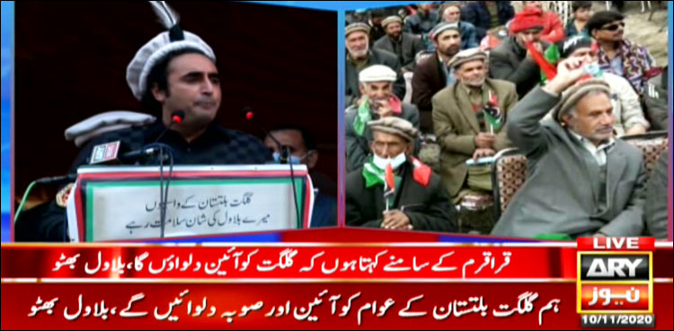 اے آر وائی نیوز کی رپورٹ کے مطابق چیئرمین پیپلزپارٹی بلاول بھٹو زرداری نے نگر میں جلسہ سے خطاب کرتے ہوئے کہا کہ میرا وعدہ ہے گلگت بلتستان کے عوام کو قومی اسمبلی اورسینیٹ میں بٹھاؤں گا، گلگت کےعوام جموریت کی تحریک چلا رہے ہیں اور یہ ماننے کو تیار نہیں۔
