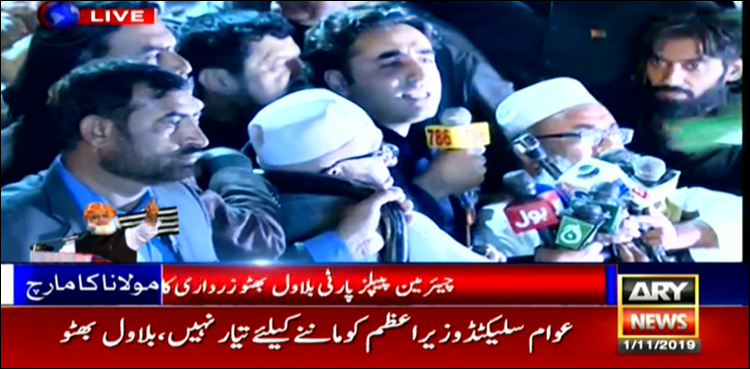 بلاول بھٹو کا مزید کہنا تھا کہ پیپلزپارٹی نےہمیشہ جمہوریت کیلئےقربانیاں دیں مگر آج جمہوریت پر مختلف انداز سے حملے کیے جارہے ہیں، الیکشن میں دھاندلی کر کے حکومتیں بنائیں گئیں۔ چیئرمین پیپلزپارٹی نے پیش گوئی کی کہ مولانا فضل الرحمان کا مارچ کامیاب ہوگا۔