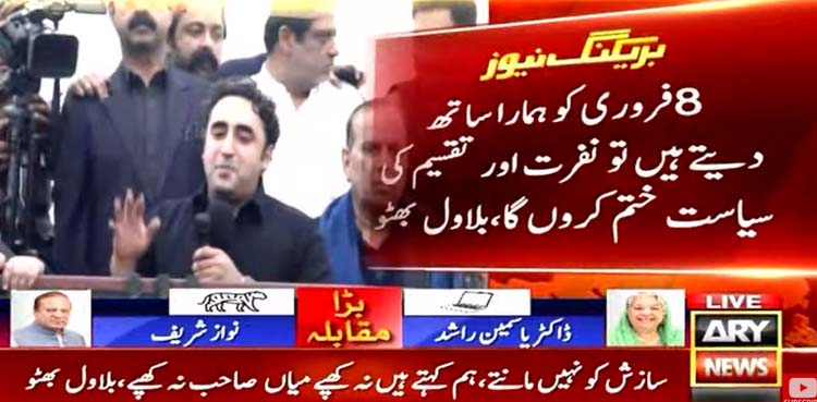 شکازرپور: پیپلزپارٹی کے چیئرمین بلاول بھٹو کا کہنا ہے کہ 8 فروری کو ساتھ دو گے تو وزیراعظم بن کر نفرت، تقسیم کی سیاست دفن کردوں گا۔